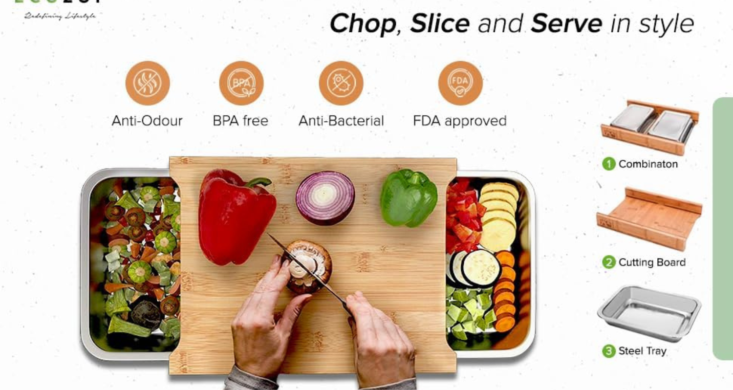 This bamboo cutting board with integrated stainless steel trays helps you chop, organise and prepare ingredients in one place while keeping your workspace clean.